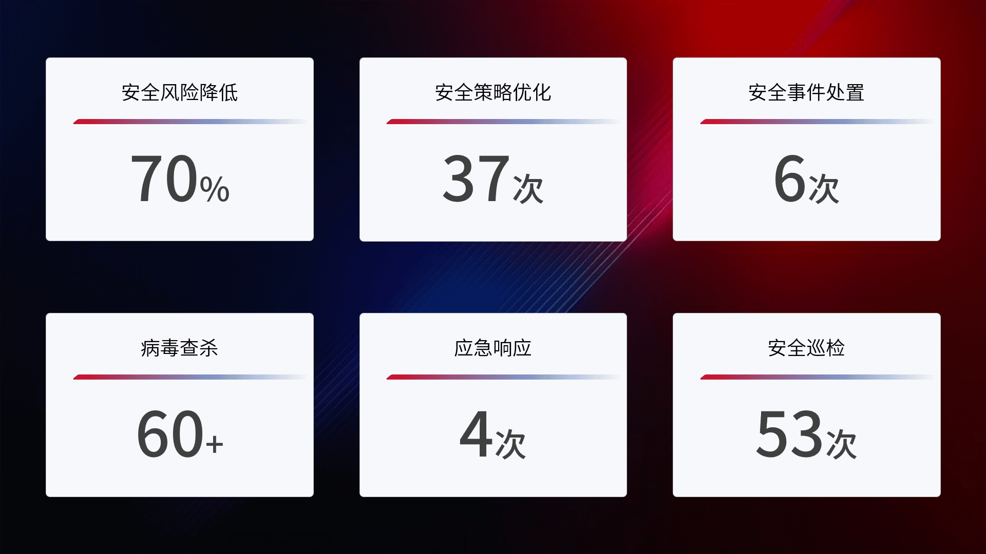 提供全面的安全事件报告体系,,,包括处置报告、、、、周报、、、季度和年度总结,,结合持续监控,,帮助客户深入了解网络安全状况。。。。